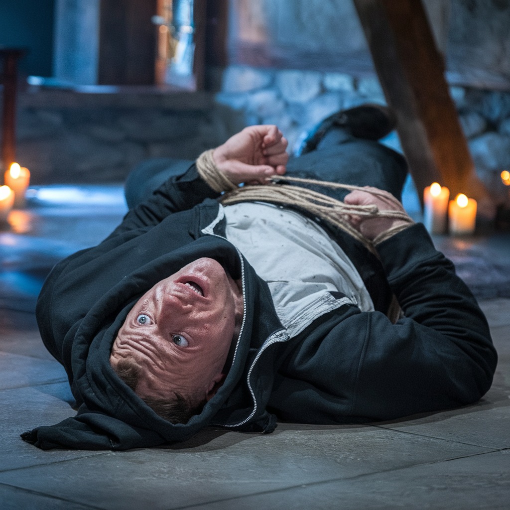 The sight before me left me frozen. Mike was tied up in the middle of the floor. What was going on? Was he not the killer after all? I moved closer and untied the cloth gag from his mouth. He gasped for air and said, “We need to get out of here. She’s coming back soon.”