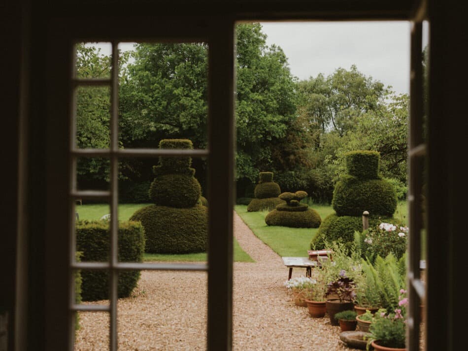 The topiary, inspired by Levens Hall, includes shapes like crowns and the dove of peace, reflecting her creative touch.