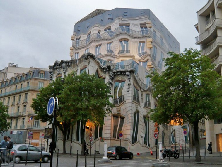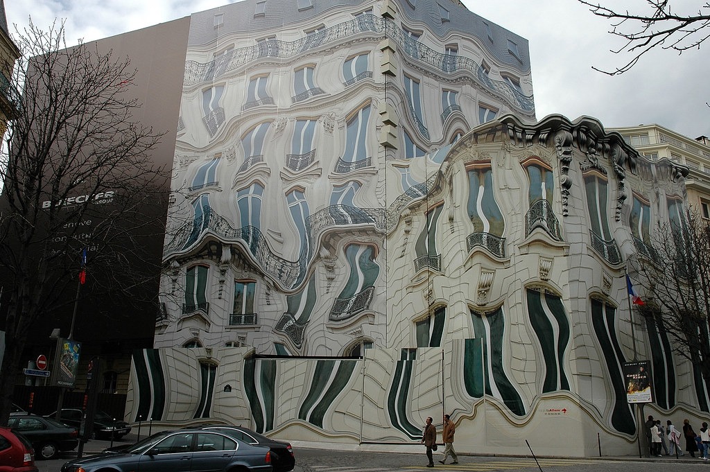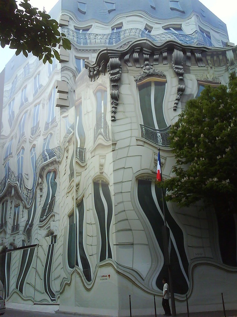 This striking illusion was created by artist Pierre Delavie in 2007 to cover the facade of a Haussmannian building undergoing restoration.