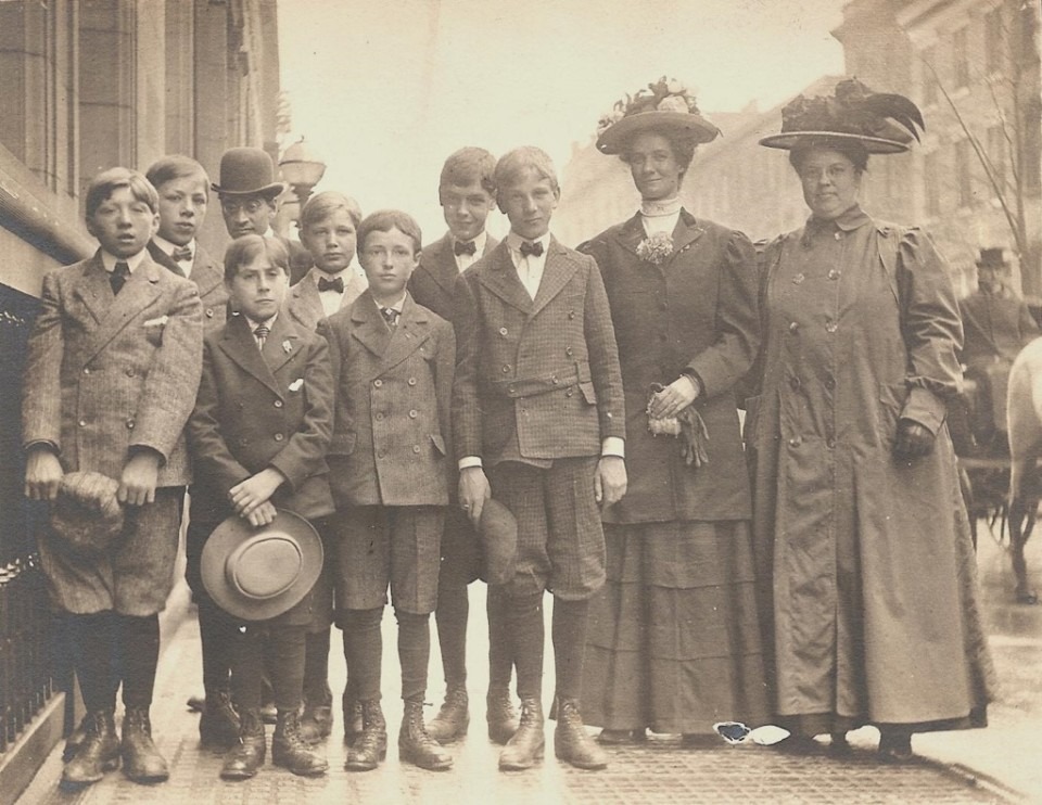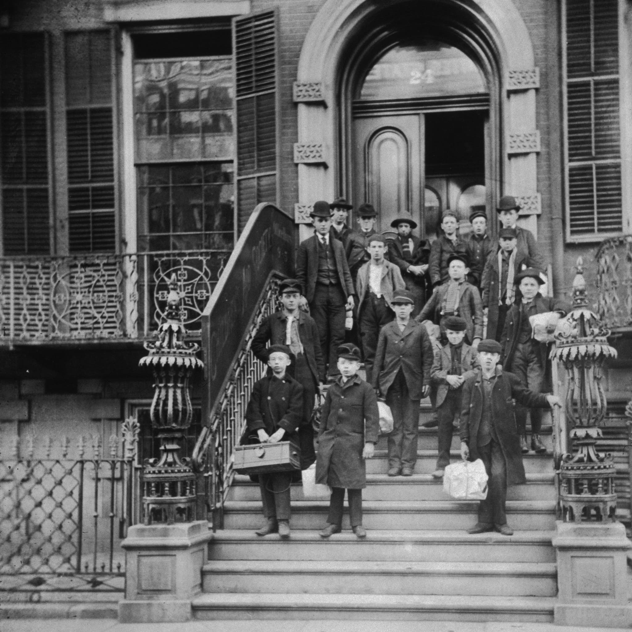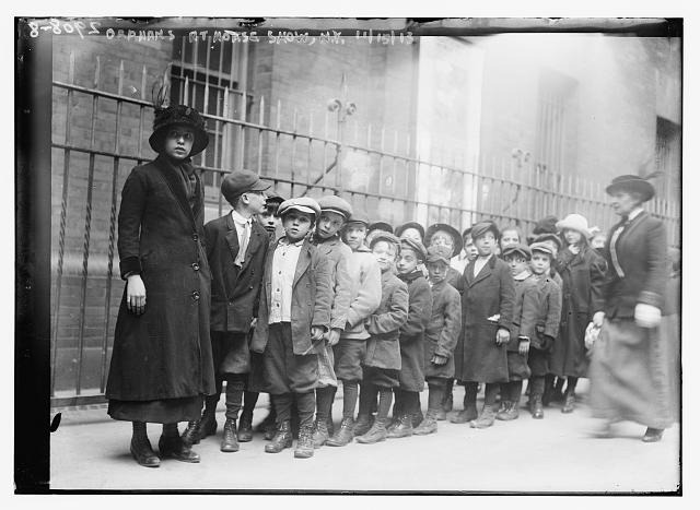 A group outside of the Children’s Aid Society’s central office in New York City, circa 1895. The children hold satchels with their belongings as they prepare to travel west.