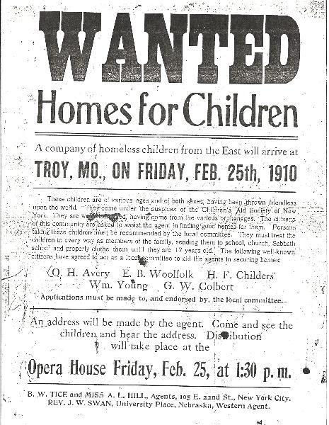 A 1910 flyer advertising a group of orphans arriving in Missouri.