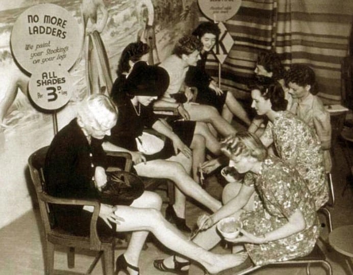 During the war years, when supplies were scarce, women on both sides of the Atlantic had to get inventive with their fashion. One creative solution that emerged was “paint on hosiery.”