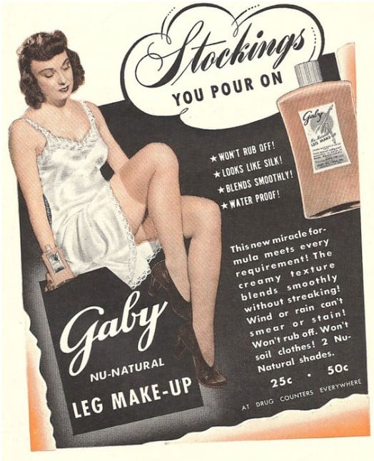 An advertisement from 1942 promoted the product with the slogan “Paint a limb and save silk,” targeting women who were conscious of supporting the war effort.