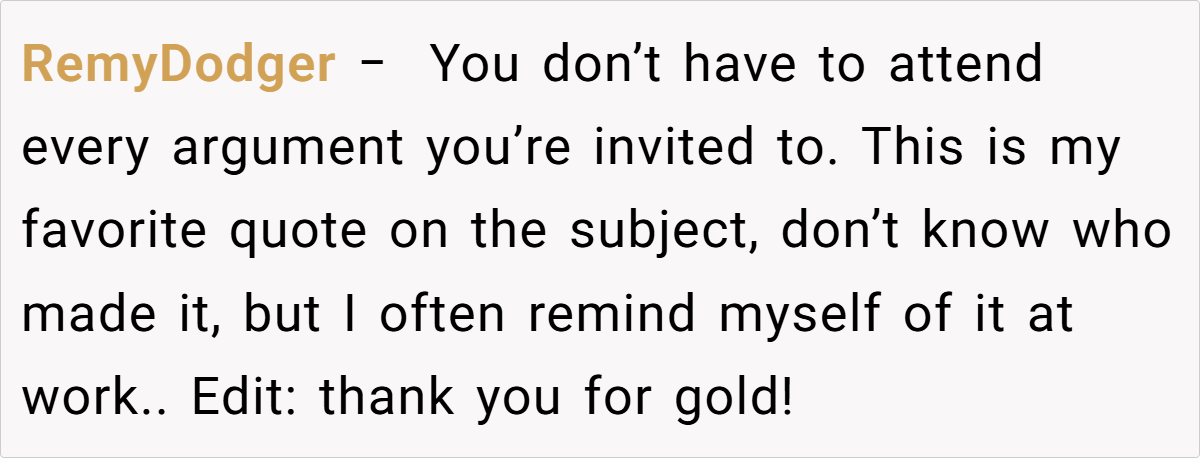 In conclusion, this post challenges us to rethink the value of every debate and reminds us that silence can often speak louder than words. It invites us to consider when stepping back might serve us better than engaging in every argument. What strategies do you use to decide when to engage—and when to let go? Share your thoughts and experiences in the comments below. What would you do if you found yourself in a similar situation?