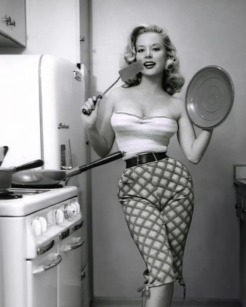 Known for her “impossible waist” and 38″-18″-36″ measurements, she became America’s most sought-after pin-up of the mid-century. The Californian beauty also captivated magazine readers with her blonde hair, bright smile, and curvaceous figure.