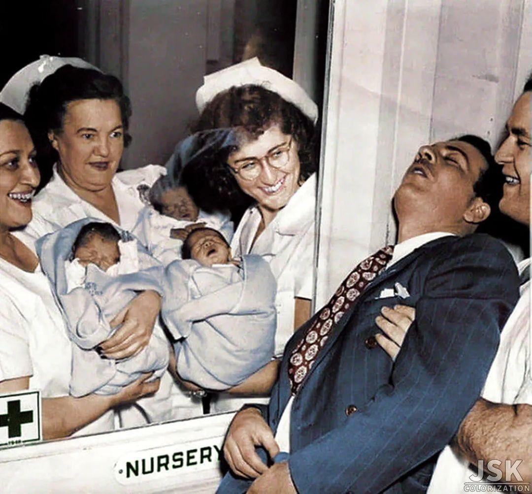 In February 1946, a photograph of a father seemingly fainting after seeing his newborn triplets for the first time became a sensation.