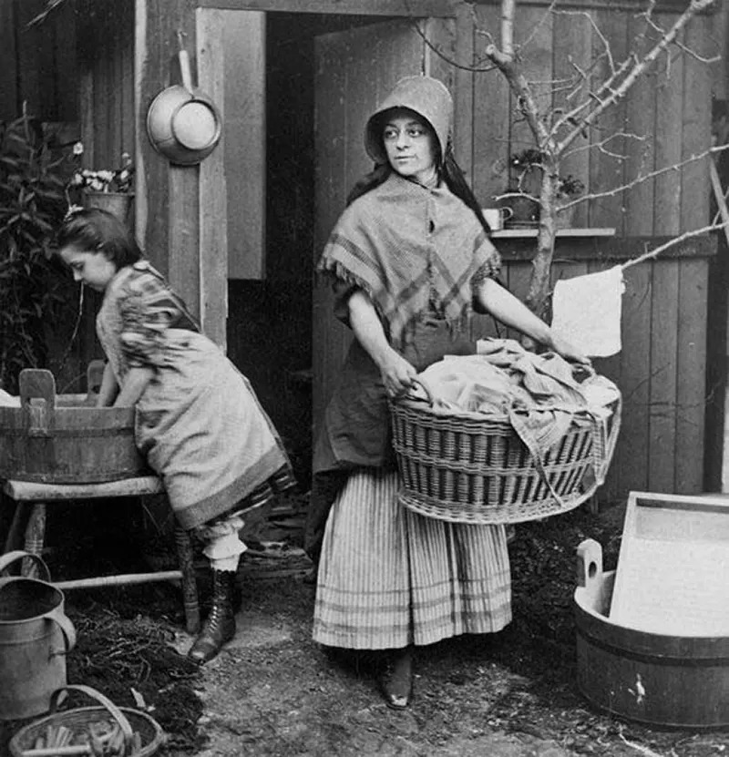 Laundry before washing machines was a labor-intensive process. Women used large metal cauldrons filled with hot water, as hot water was more effective at removing dirt.