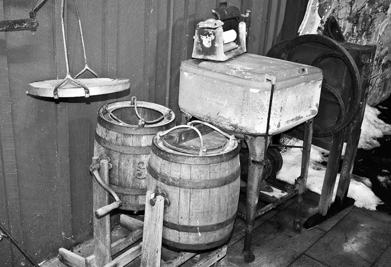 18. A woman operating a vintage hand-cranked washing machine in a basement laundry room