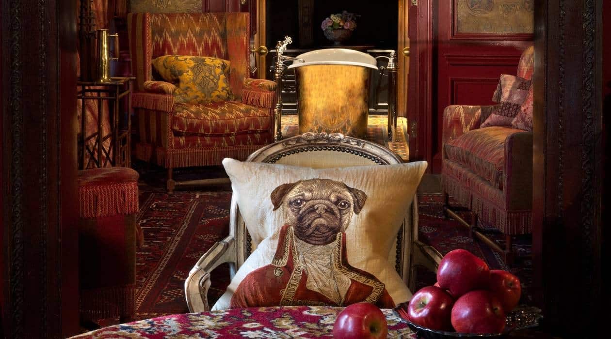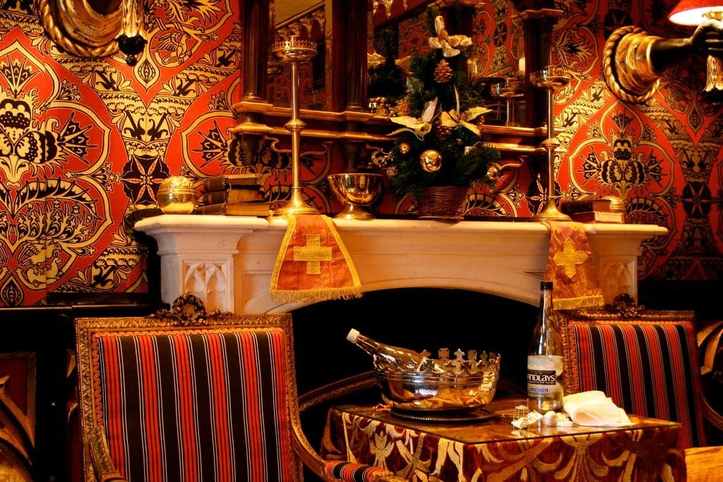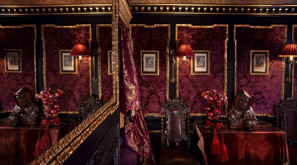 This area features a painted ceiling inspired by Rossend Castle in Fife, and the terrace is filled with topiaries and urns, providing a serene contrast to the main dining room’s dark, brooding ambiance.
