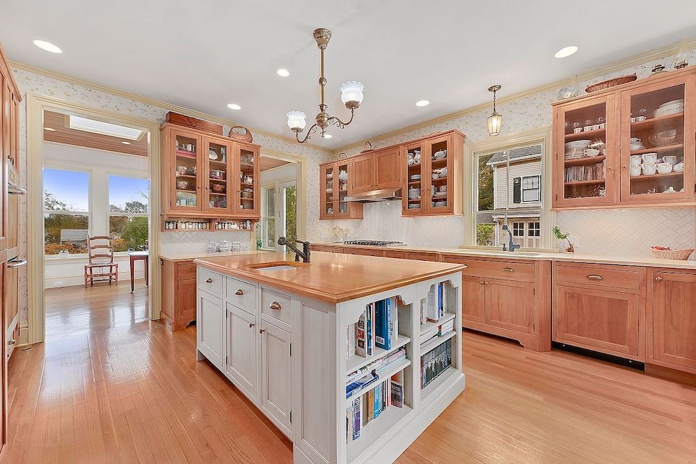 The kitchen, though modernized, blends seamlessly with the rest of the house.