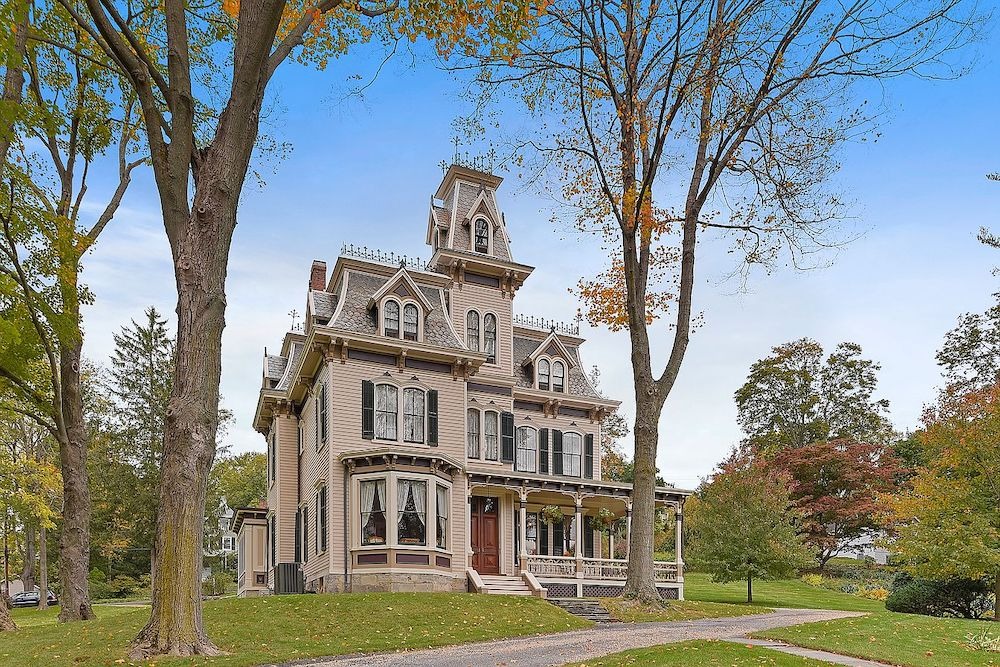 The house features classic Victorian elements such as mansard roofs, a tower, bay windows, a heavy bracketed cornice, and intricate iron cresting along the roofline.