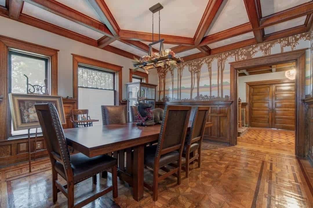 This elegant formal dining room is complete with embellished brand ceilings that have a touch of grandeur.