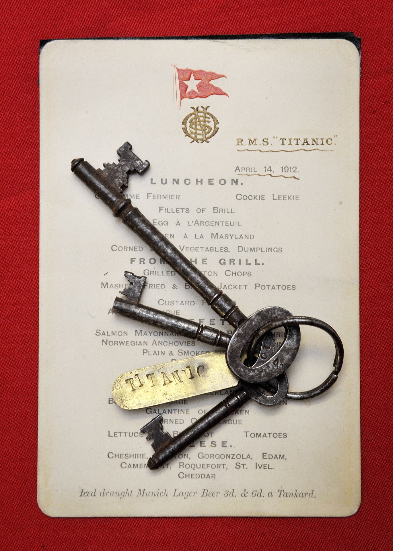 A menu given to first-class passengers on the day of the sinking of the Titanic and a set of keys used by Titanic crewman Samuel Hemming to unlock the door where the lifeboat lanterns were held after he was ordered by the ship’s captain to ensure all 15 lifeboats had lit oil lamps.