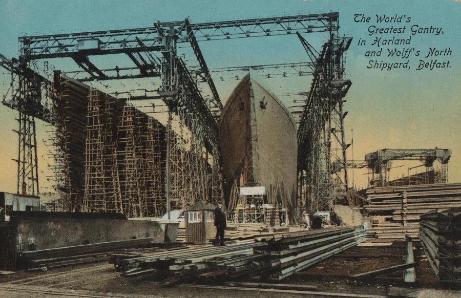 A colored Postcard showing ‘The Great Gantries’ in which RMS Titanic & Olympic were built: Harland & Wolff shipyards, Belfast 1911