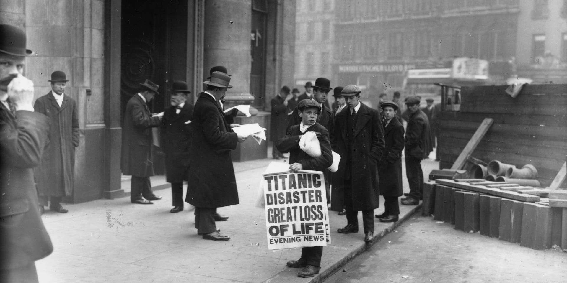 Newspaper boy Ned Parfett sells copies of the Evening News, telling of the Titanic maritime disaster, outside Oceanic House, the London offices of the Titanic’s owner, the White Star Line,