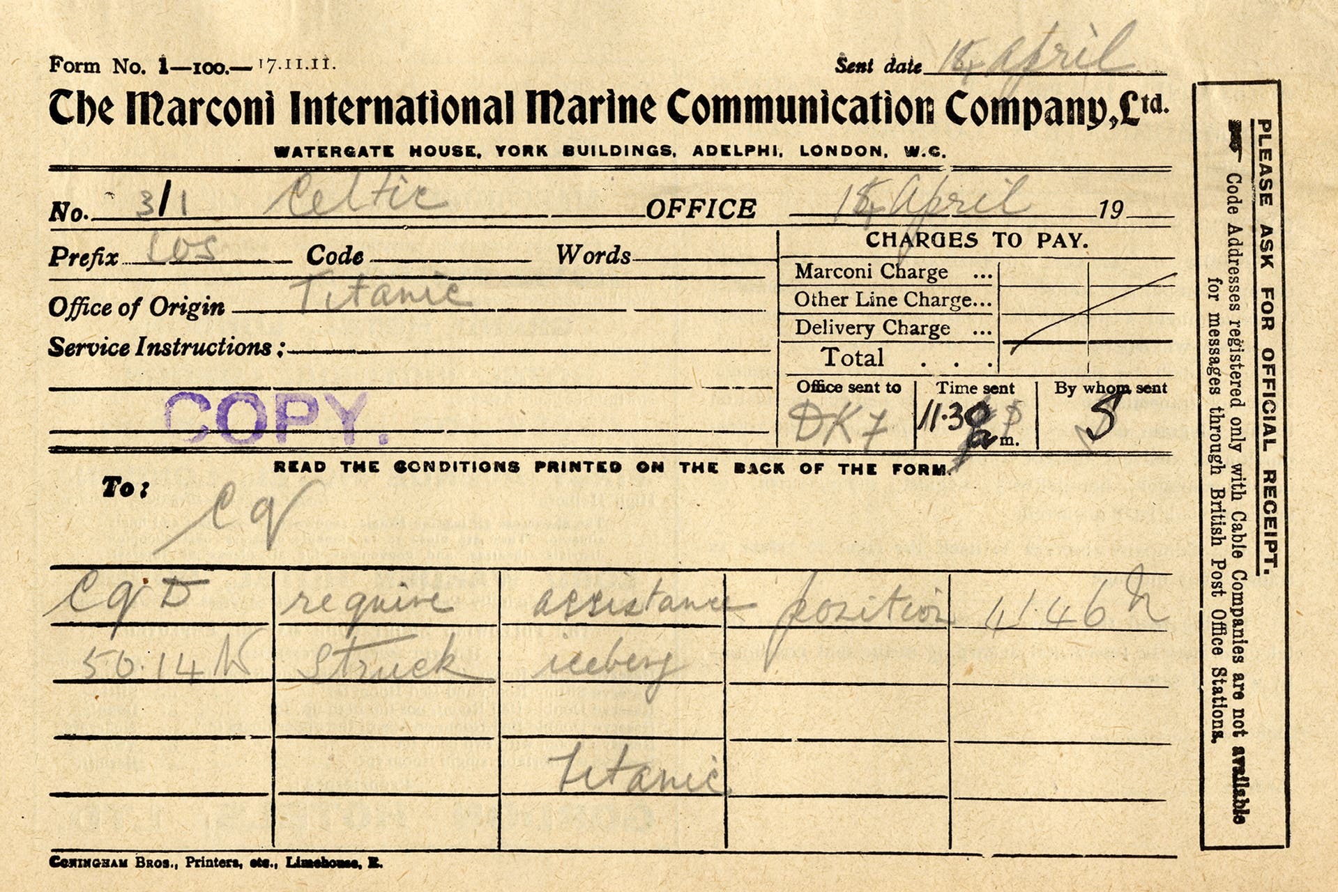 Message sent from Titanic: ‘CQD require assistance position 41.46 N 50.14 W struck iceberg Titanic.’ ‘CQD’ was the international signal used before the introduction of ‘SOS.’