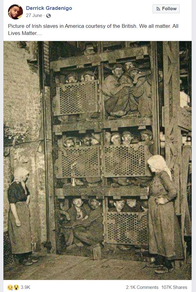 One notable instance is a Facebook post claiming the photograph depicts “Irish slaves in America.” This post, which was shared hundreds of thousands of times, was removed by Facebook for presenting a false historical narrative.