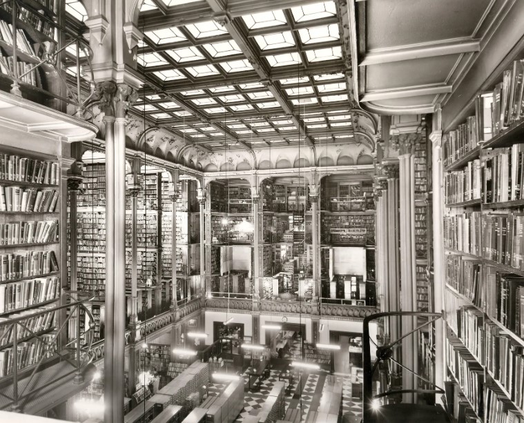 Visitors were greeted at the entrance by busts of famous writers like William Shakespeare, John Milton, and Benjamin Franklin. With towering pillars, five levels of intricately carved cast-iron shelves, and an impressive atrium, the library often evoked comparisons to the enchanting worlds found in Harry Potter.