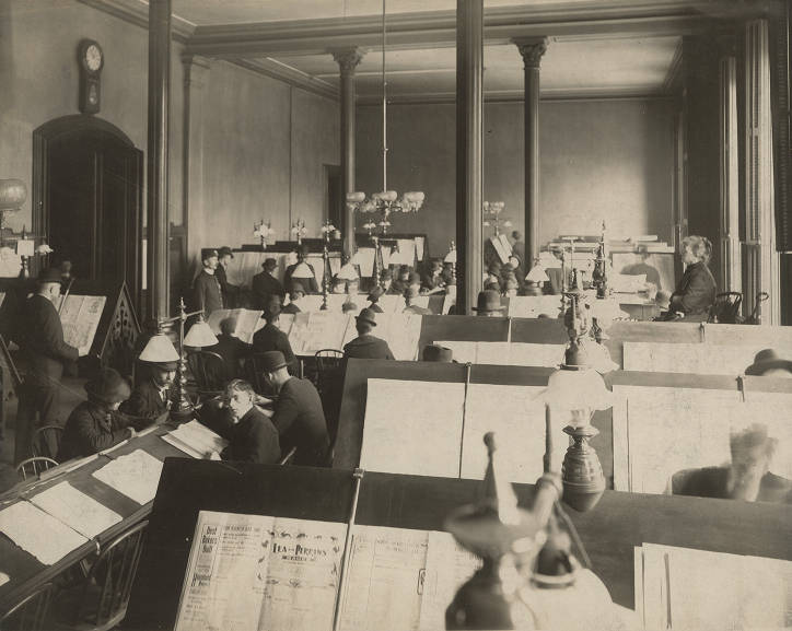 “The main hall is a splendid work”, The Enquirer reported at the opening. “The hollow square within the columns is lighted by an arched clear roof of prismatic glass set in iron, the light of which is broken and softened by a paneled ceiling of richly colored glass.