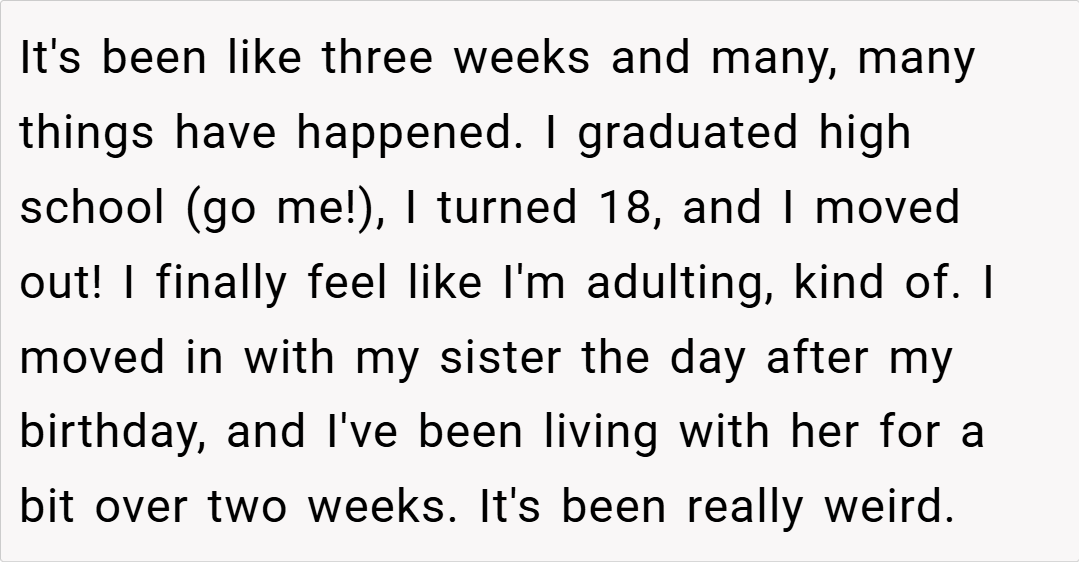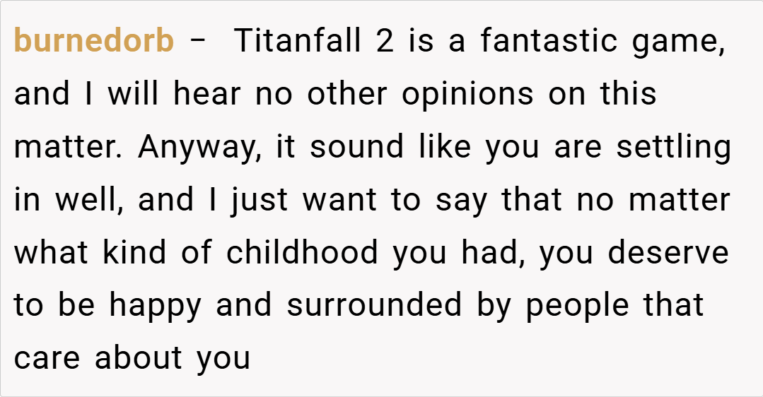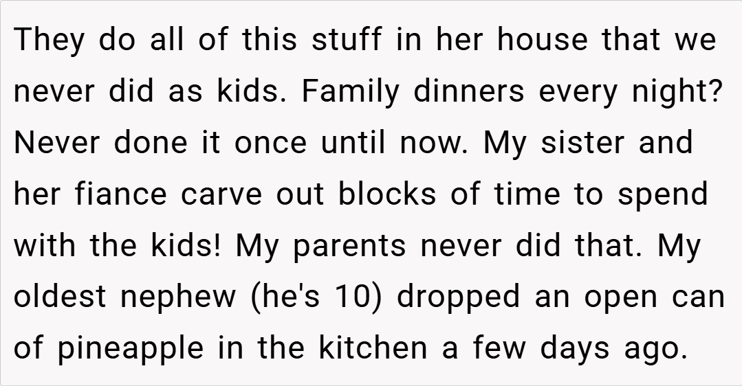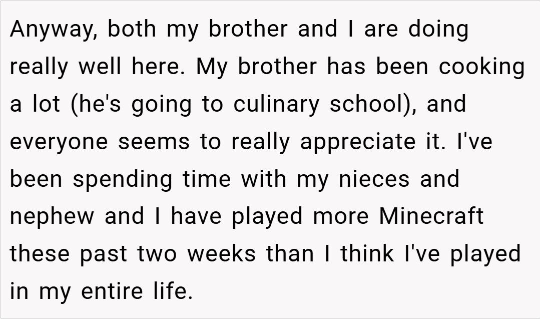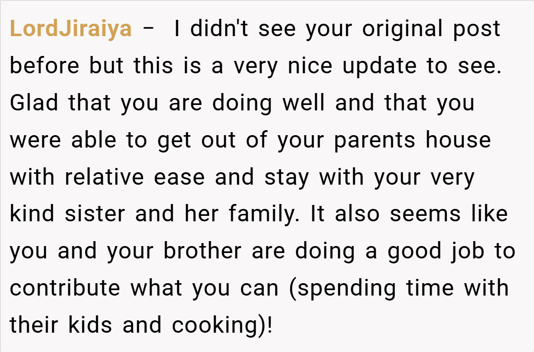 Now living with her sister, the OP is discovering that things can be different. From witnessing gentle, caring moments like her sister’s fiancé patiently soothing a crying niece, to enjoying quality time with cousins and even getting swept up in the world of video games, this update is a heartfelt thank-you to a more nurturing environment. It also raises some questions about the ways we grow and what it really means to “adult.”