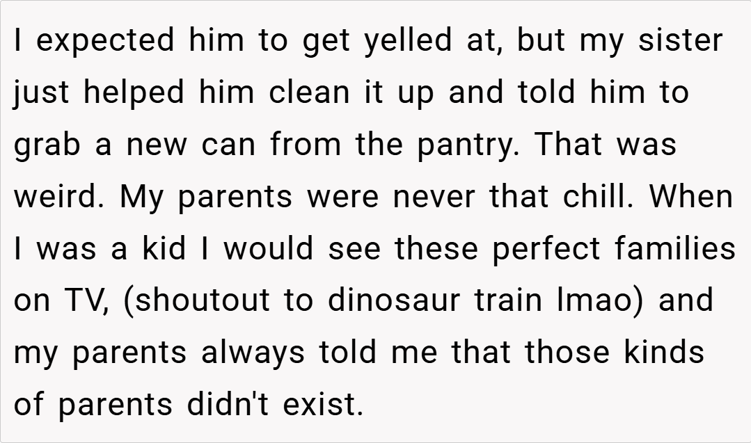 In the OP’s new home, simple acts like family dinners and spending dedicated time with children offer a tangible reminder that care and empathy are not relics of an idealized past—they’re achievable and, in many cases, the norm. The difference is palpable. Instead of an environment where mistakes were met with harsh rebukes, there’s now a setting where even small mishaps—like a dropped can of pineapple—are handled with calm, constructive guidance.