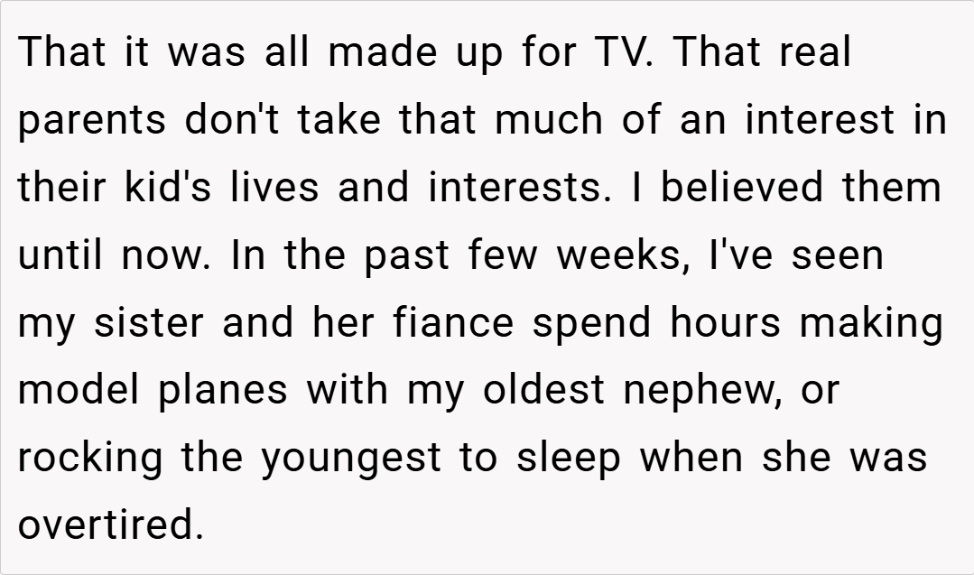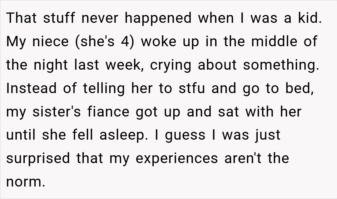 Delving further, this update offers a glimpse into how exposure to more supportive family dynamics can reshape one’s expectations. The OP’s astonishment at witnessing model-like parenting—be it making model planes with a nephew or soothing a toddler in the middle of the night—illustrates the profound impact that genuine care can have on a young adult’s perception of family life.