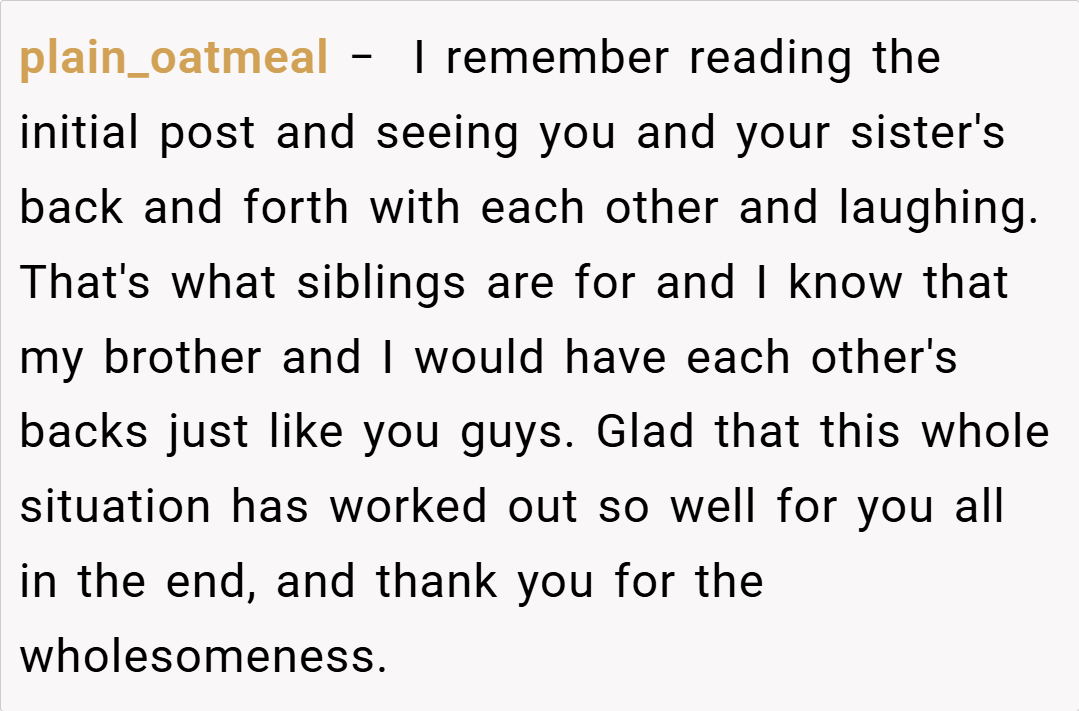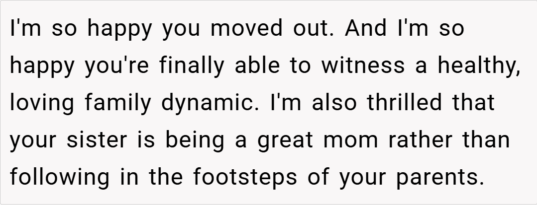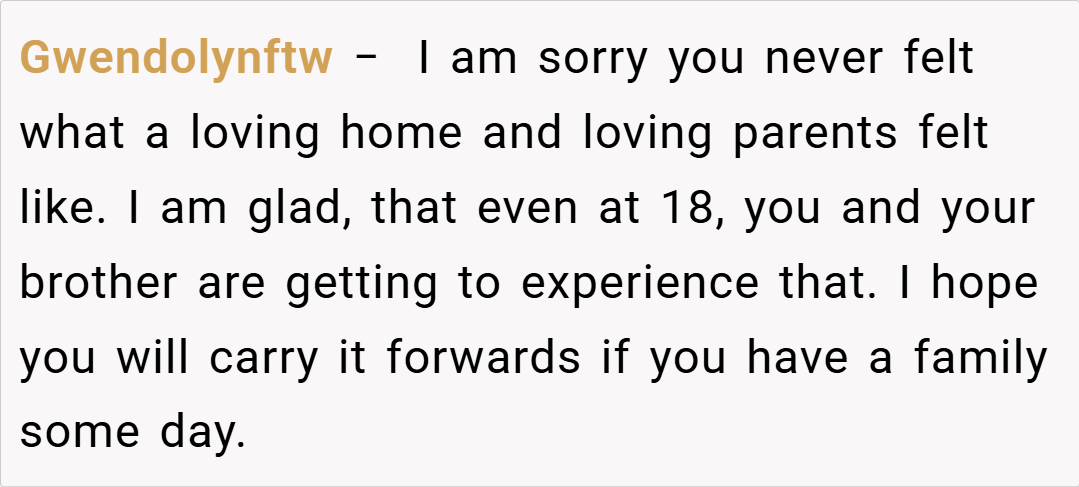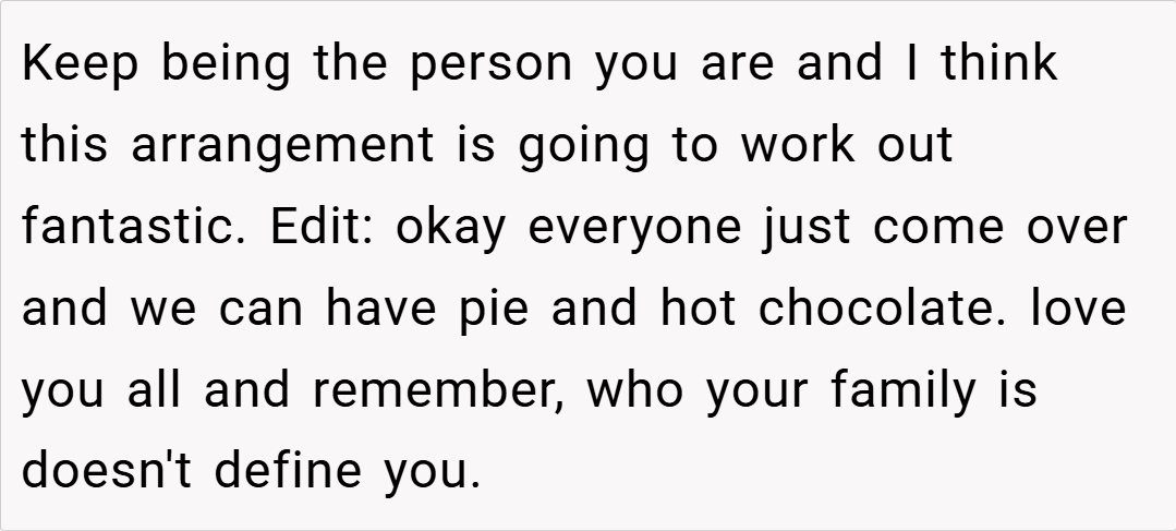 Moreover, the broader societal implications of this shift shouldn’t be overlooked. The update subtly touches on the evolving landscape of what it means to be “family” today. The OP’s experience is a testament to the fact that nurturing environments aren’t just idealized images on TV—they’re real, attainable, and can provide a roadmap for better interpersonal relationships.