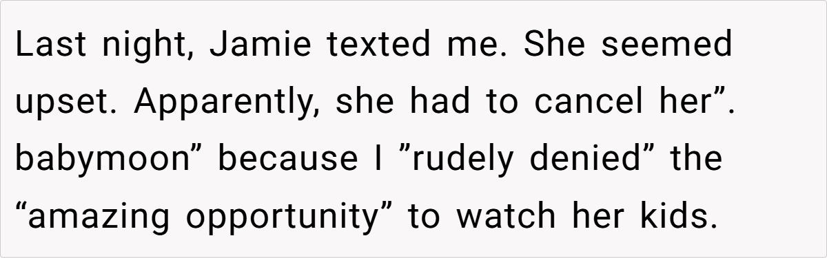 That’s the dilemma OP (Original Poster) faced when her sister Jamie, who had previously demanded OP babysit her three children while she went on a “babymoon,” retaliated after OP refused. Jamie, having spent nearly all her money on the trip, not only insisted OP reimburse her but also demanded she fund a Disney vacation and buy expensive baby supplies.