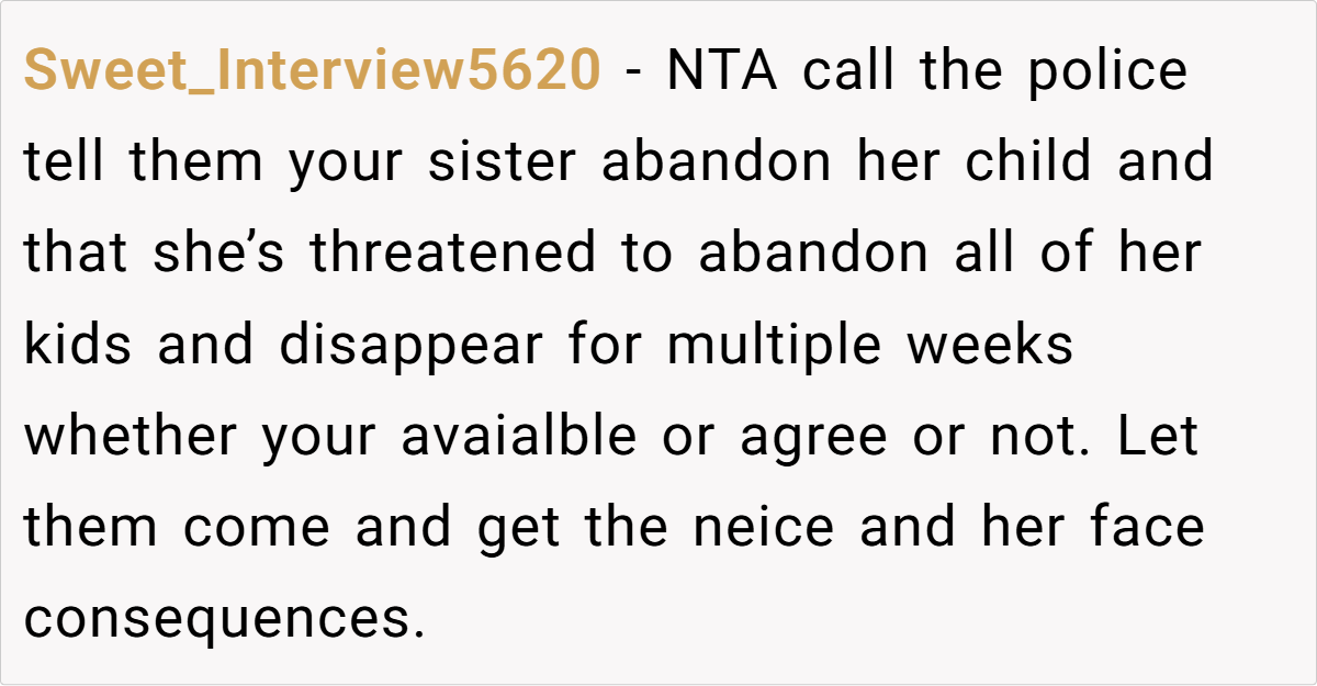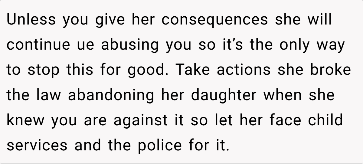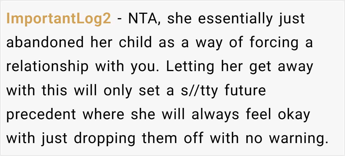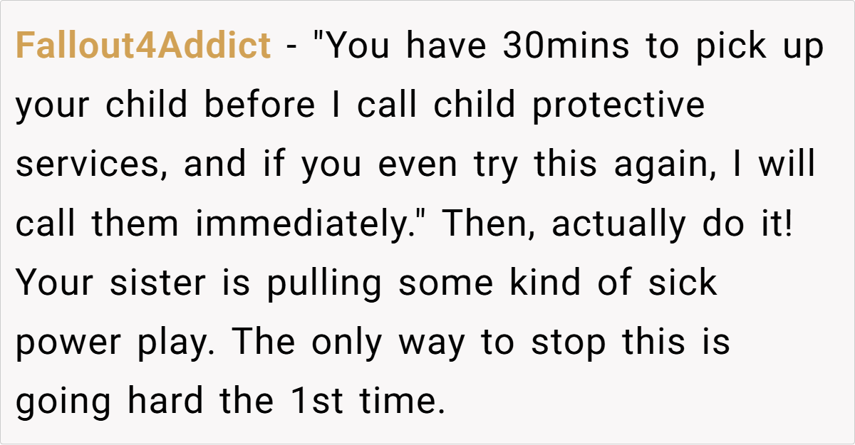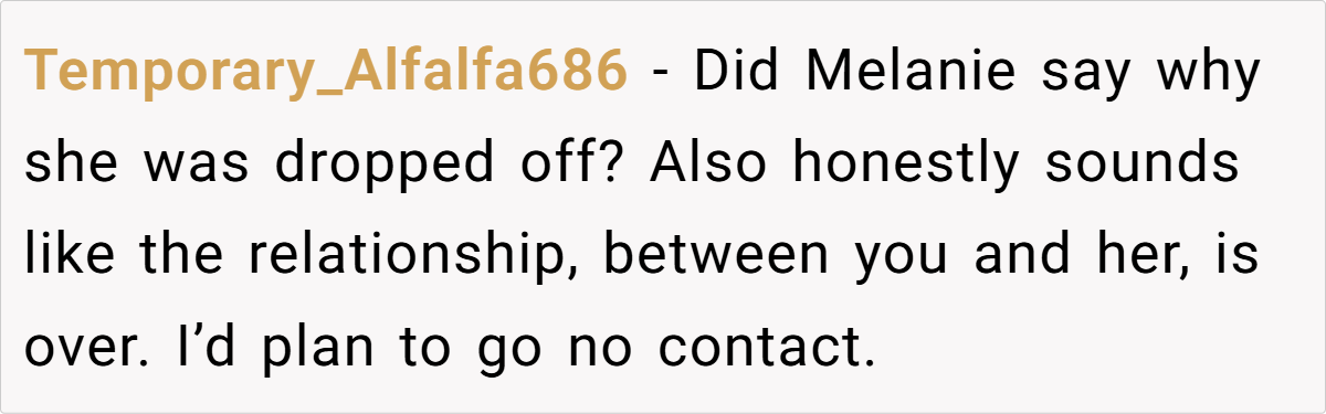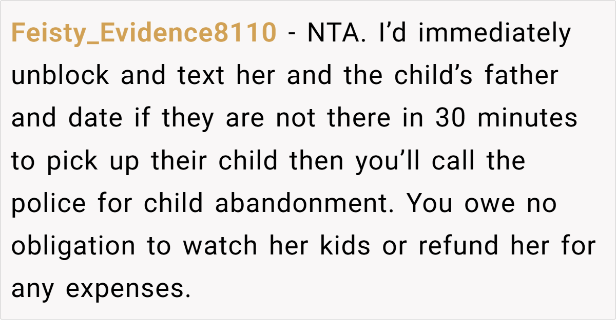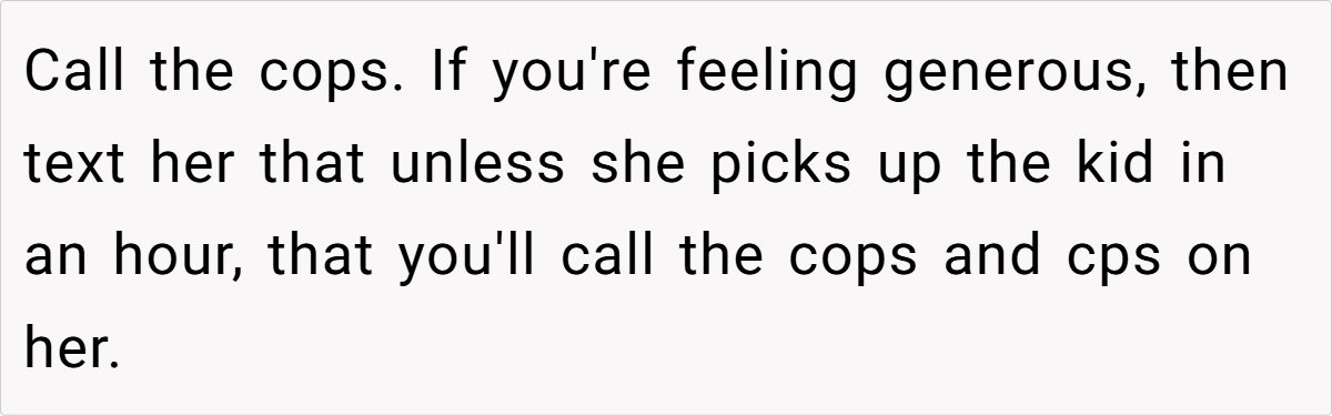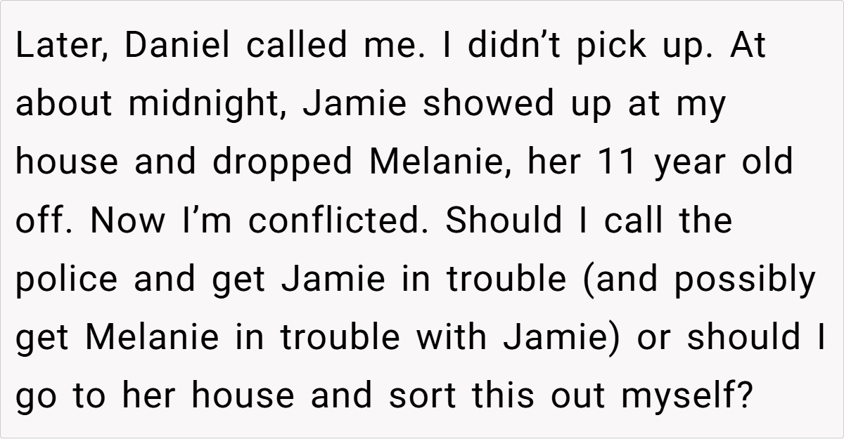When OP blocked Jamie’s messages, Jamie escalated further by showing up at OP’s house at midnight—dropping off her 11-year-old daughter, Melanie, unannounced. Now, OP is left wondering whether she should call the police for child abandonment or try to handle the situation herself.