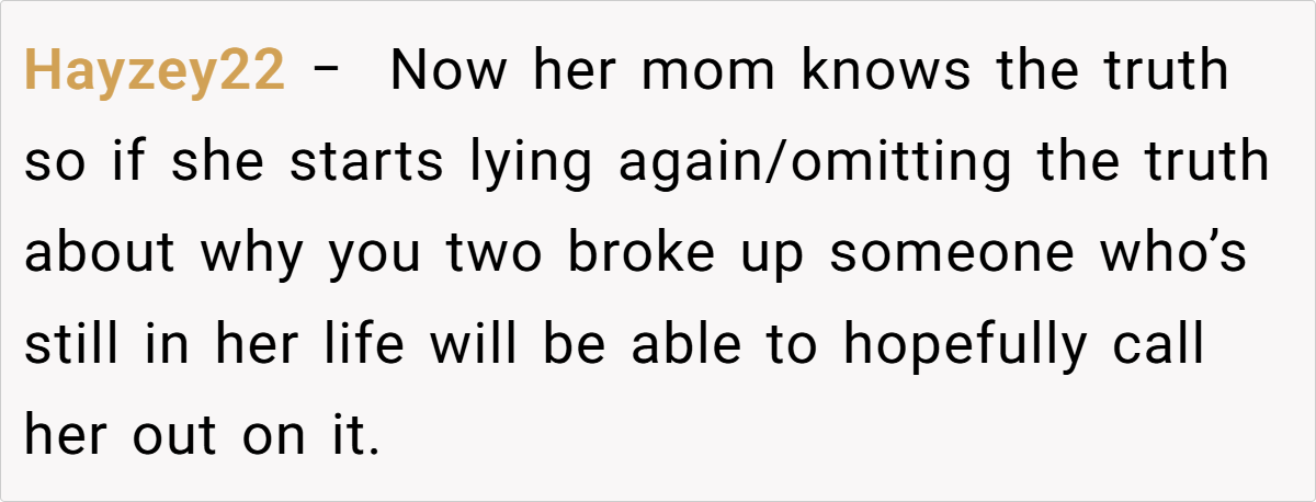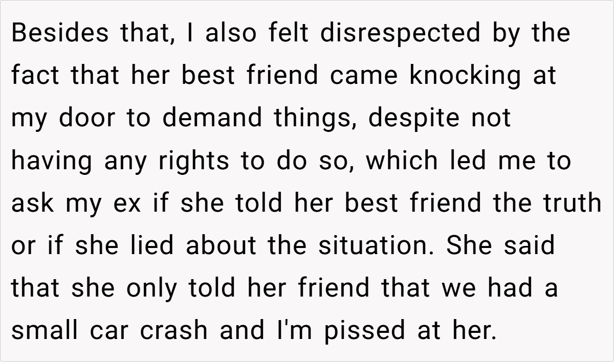 The encounter, as described, wasn’t merely about a car accident—it was about a series of actions that flouted basic respect for mutual safety and responsibility. The narrator points out that the issue wasn’t the crash itself, but her ex’s complete disregard for the potential consequences of her actions. This recklessness, paired with an attempt to downplay the severity of the incident by lying to friends and family, only deepened the sense of betrayal. Such behaviors are indicative of a pattern where accountability is sidestepped, and personal boundaries are continuously violated.