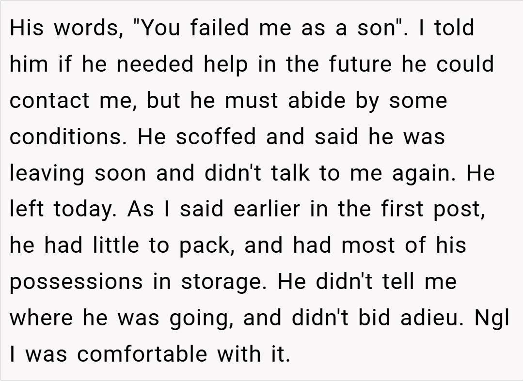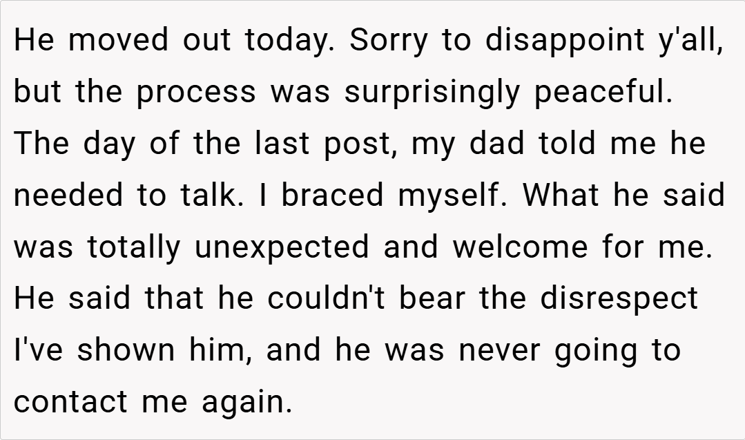 Sometimes, cutting toxic ties brings unexpected relief. In this update, a 37M shares that his dad moved out today after a long struggle. Despite the heavy words exchanged—his dad declared, “You failed me as a son” and vowed never to contact him again—the process was surprisingly peaceful. While a part of him wished for a proper goodbye, he now feels a weight lifted off his shoulders, a freedom he hasn’t experienced even after leaving home years ago.