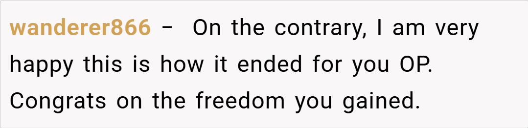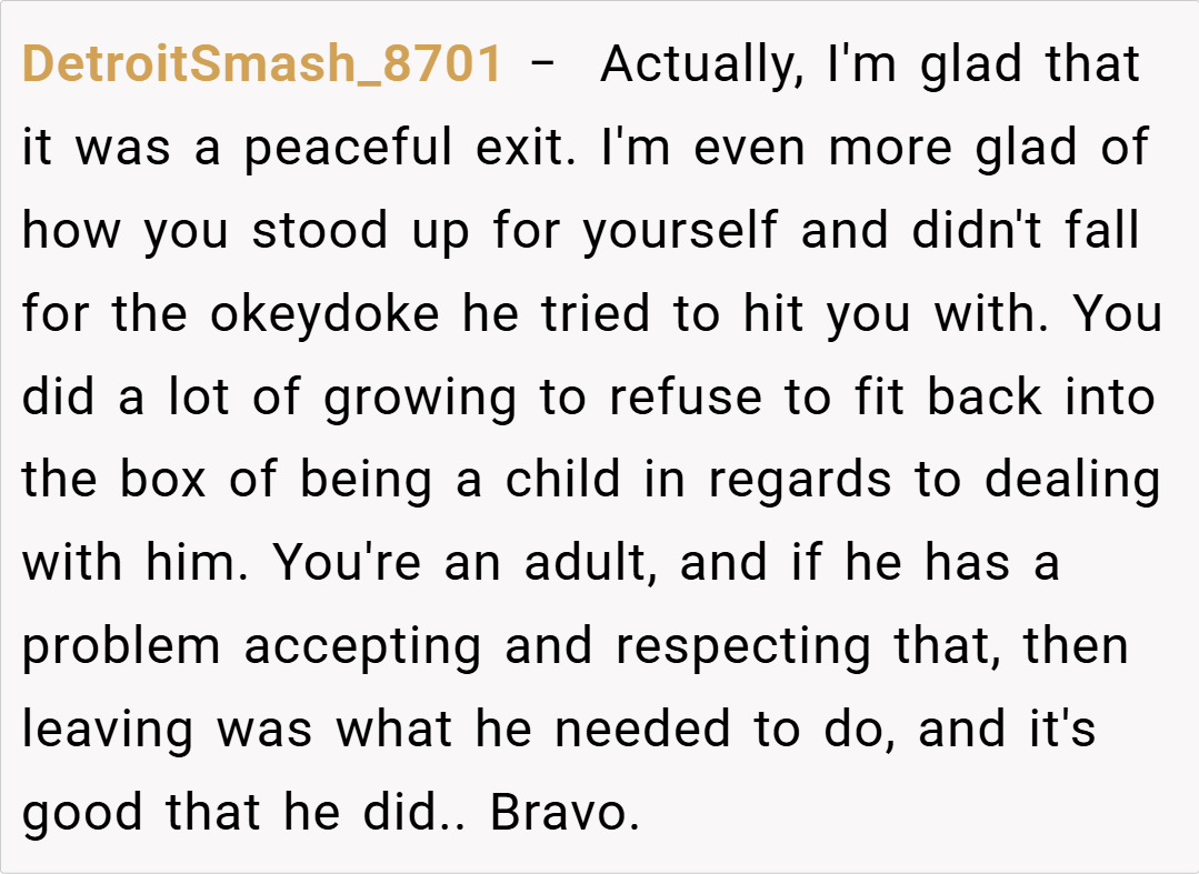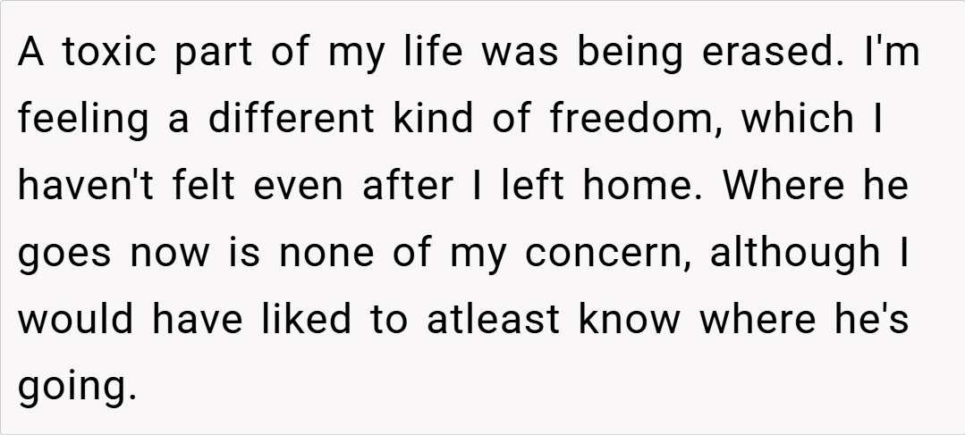 Another commented, “Cutting off toxic family members is never easy, but sometimes it’s the only way to heal. You have every right to feel free and unburdened by his negativity.” Conversely, a few users suggested that a proper goodbye might have offered more closure. One redditor mentioned, “It might have helped to know where he was going, but if his leaving brings you relief, then that’s what matters most.”