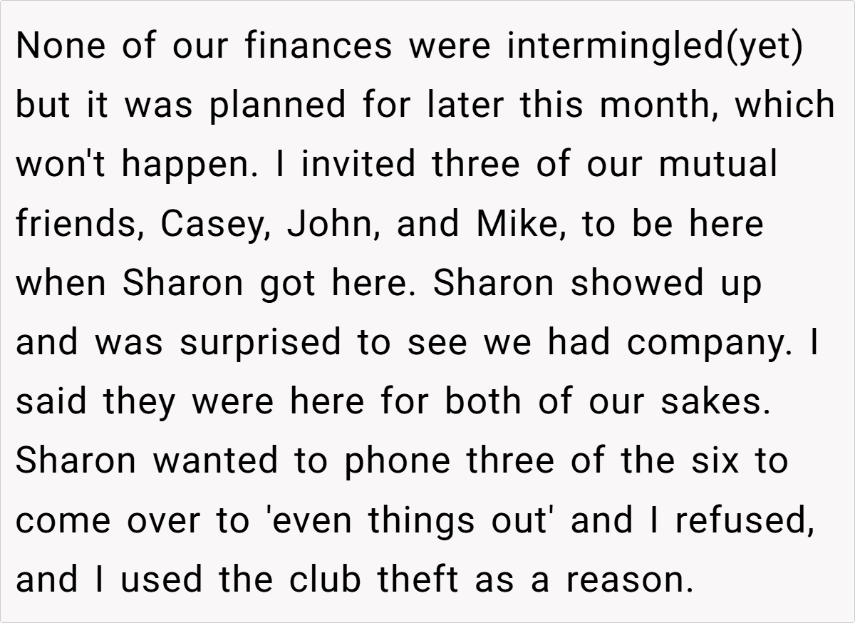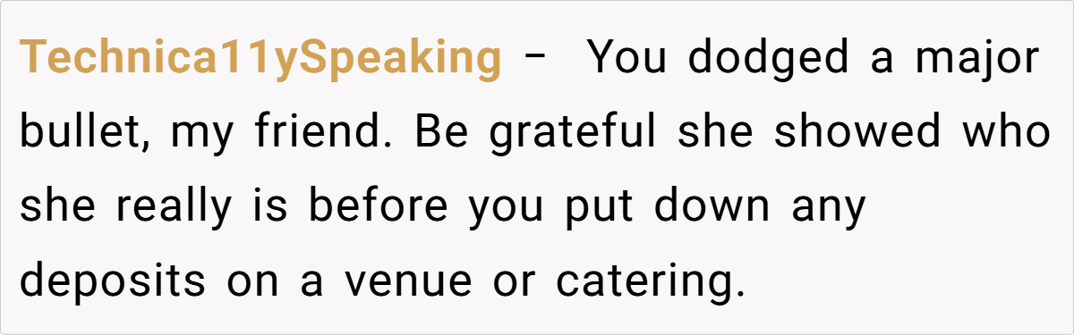 Commenters like Technica11ySpeaking and RubyTx echoed the sentiment that he was lucky to have seen Sharon’s true nature before making any significant commitments, such as booking a venue or further intertwining finances. Others, like Buttered_Crumpet09, offered practical advice, suggesting he change the locks and secure any potential assets that Sharon might have access to.