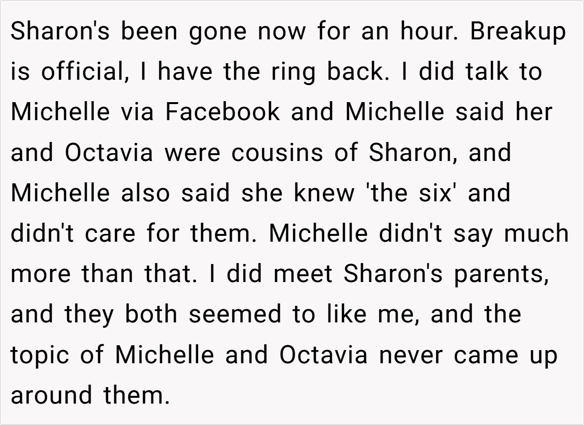 The story details a breakup that was set in motion when the protagonist, after receiving unsettling revelations about his fiancée’s hidden life and her manipulation tactics, decided to call off the engagement. Sharon, the fiancée, seemed to act entitled and even dismissive when confronted about the situation. As the night unfolded with friends offering support, the protagonist began to process the realization that, although heart-wrenching, this breakup might have been a blessing in disguise.