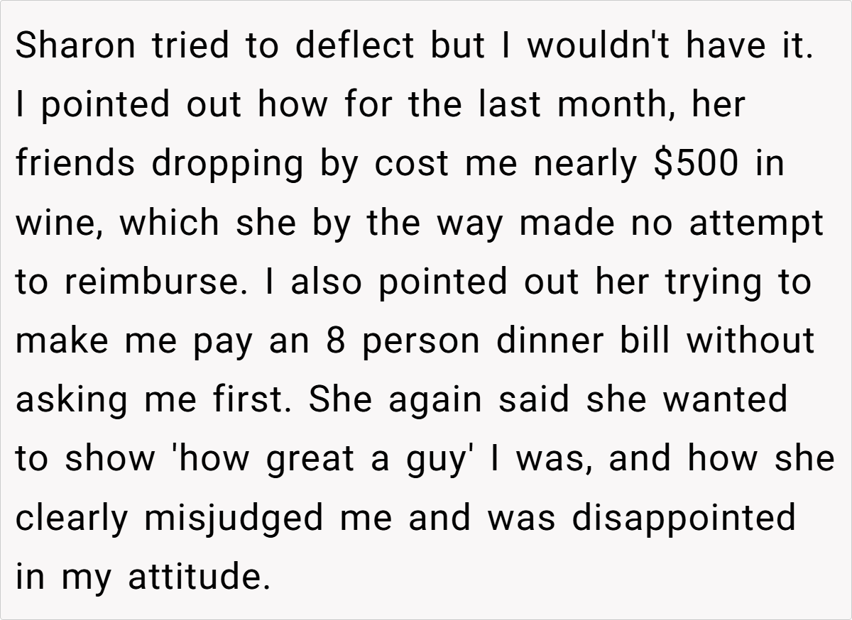 “Sharon’s expectation of her partner paying for things without consultation and her deflection of responsibility with gaslighting tactics are major warning signs that should not be ignored.” He suggests that the protagonist acted wisely by confronting the issues head-on, asserting his boundaries, and not being swayed by Sharon’s emotional manipulation.