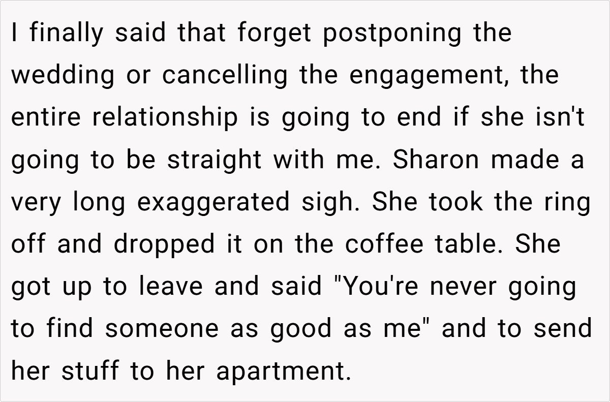 After reading this story, how do you feel about the situation? Would you have handled the confrontation differently, or do you think the protagonist made the right decision in calling off the engagement? It’s clear that Sharon’s attitude was toxic, but breaking up with someone is never easy, even when you know it’s the best choice for your well-being. Let us know your thoughts—how do you deal with red flags in relationships, and what advice would you offer to someone in a similar position?
