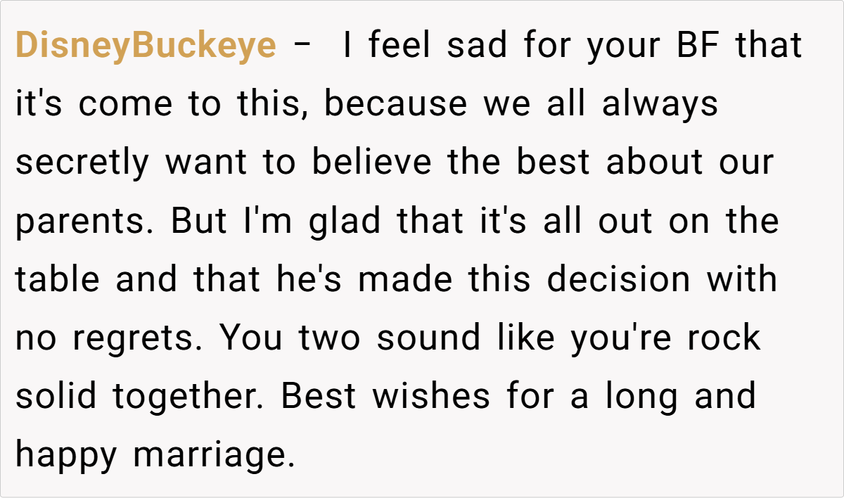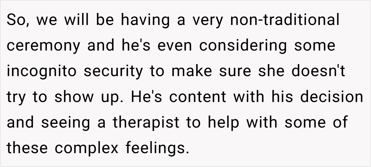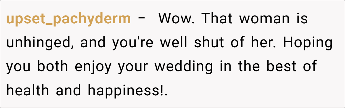 Many redditors applaud the couple for prioritizing their well-being and taking a stand against toxic family behavior. Some express sympathy for the fiancée, noting that no one should endure disparaging remarks about their character or past. While opinions vary, the prevailing sentiment is that sometimes a non-traditional approach, even if it means excluding a family member, is necessary to preserve peace and respect on one of life’s most important days.