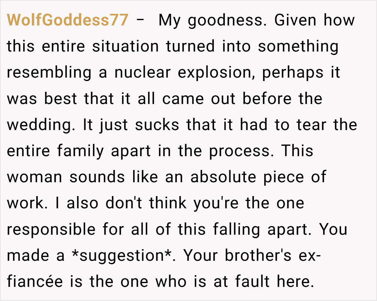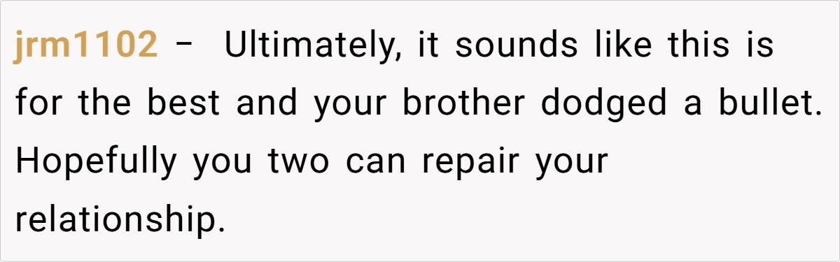 The Reddit community’s responses range from pragmatic support to wry humor. Some users applaud the poster for sparing her brother from a potentially disastrous marriage, while others commiserate over the painful fallout of family secrets. These candid and often humorous takes reflect a mix of empathy and sharp insight into how family dynamics can spiral out of control.