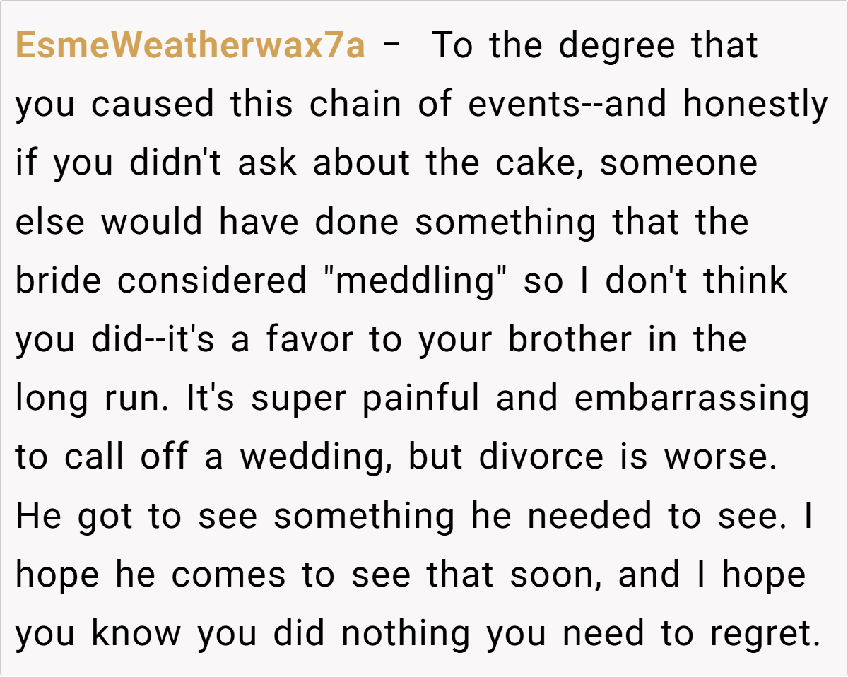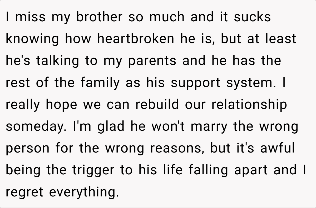 This insight suggests that even amidst conflict, nurturing a strong friendship can act as a buffer against the fallout. In this case, the original poster’s regret about inadvertently triggering her brother’s breakup shows how delicate family bonds can be, and how one miscommunicated gesture can have far-reaching consequences.