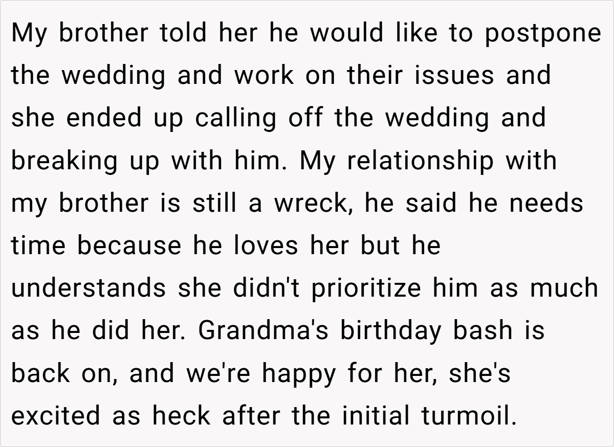 ‘Update – AlTA for suggesting that my brother and his fiancée bring out a cake at midnight on their wedding day for our grandma’s 80th birthday?’