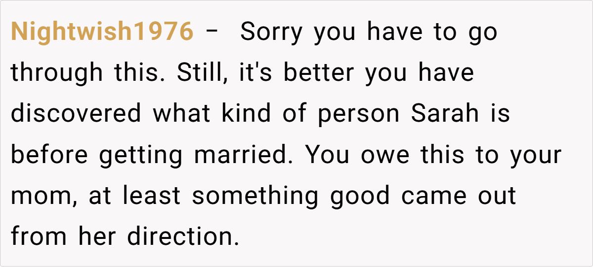 Reddit users overwhelmingly supported the man’s decision to end his relationship with Sarah and maintain boundaries with his estranged family. Many commenters praised his courage in standing up for himself and criticized Sarah for her lack of empathy and betrayal. Some users shared their own experiences with family estrangement, emphasizing the importance of prioritizing one’s mental health over societal expectations of reconciliation.
