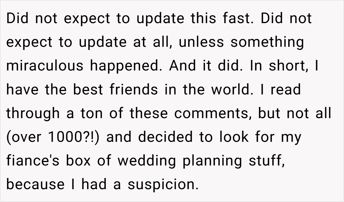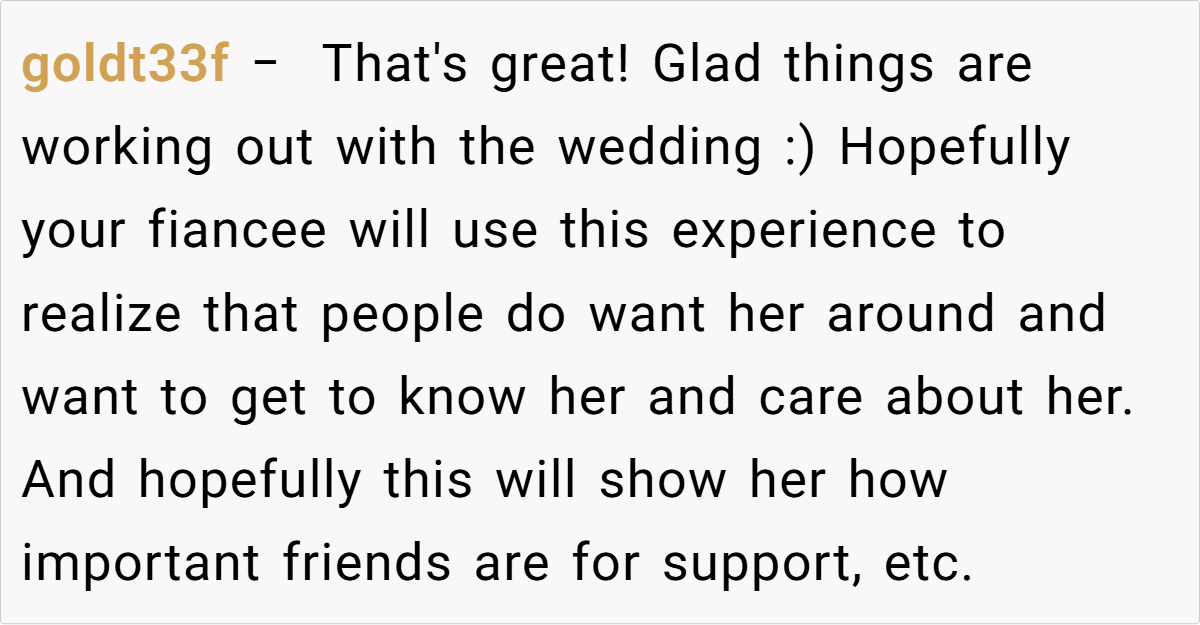 This update shows a heartwarming turnaround in wedding planning. After tensions rose over her lack of bridesmaids and the pressure of a big church wedding that wasn’t true to her style, the fiancée’s mood took a positive turn thanks to some thoughtful intervention from close friends. What began as a crisis nearly leading her to call off the wedding is now evolving into a more intimate celebration that truly reflects her wishes.