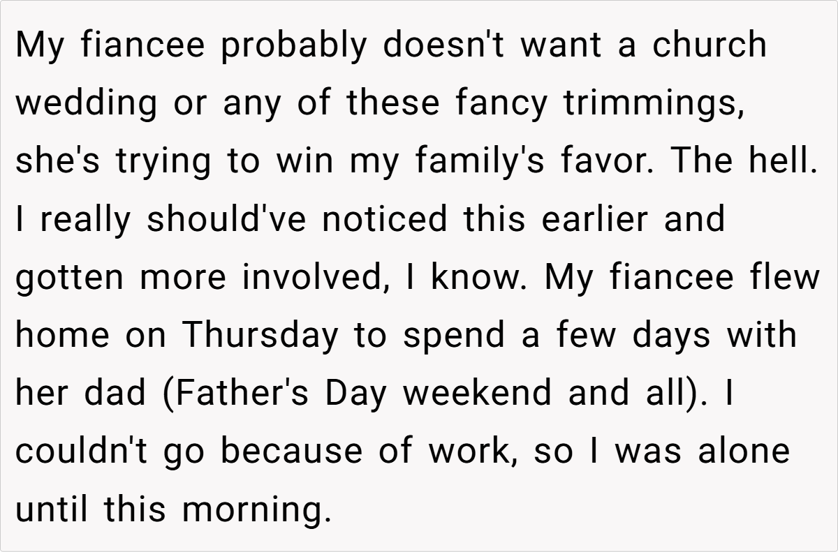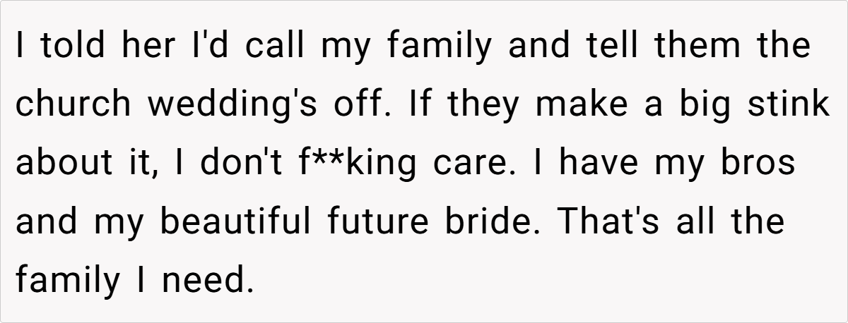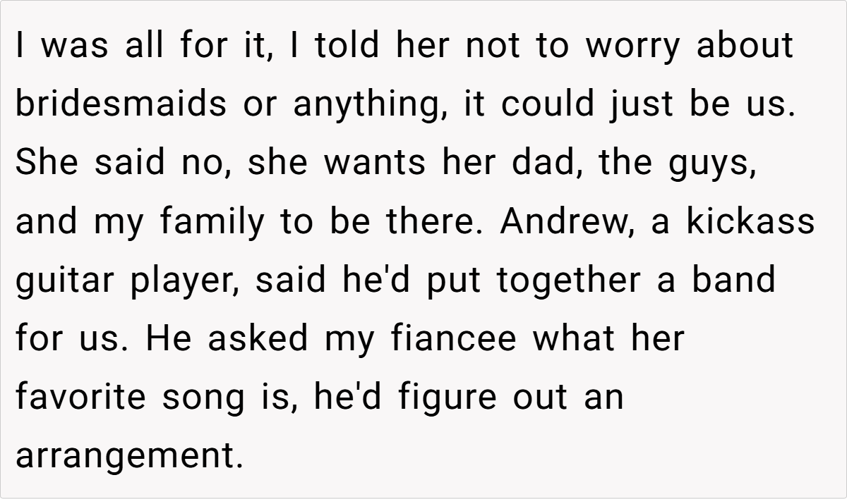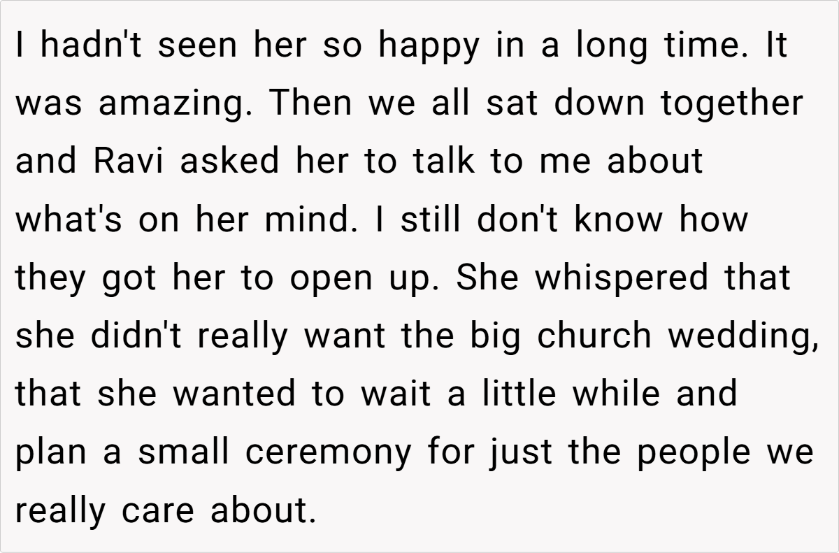 Many redditors applaud the groom for recognizing his fiancée’s hidden distress and for standing by her true wishes rather than conforming to family expectations. They appreciate the intervention by her friends, which helped her see that a small, meaningful celebration could be just as joyful as a traditional church wedding.