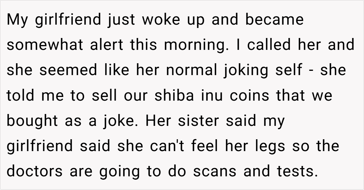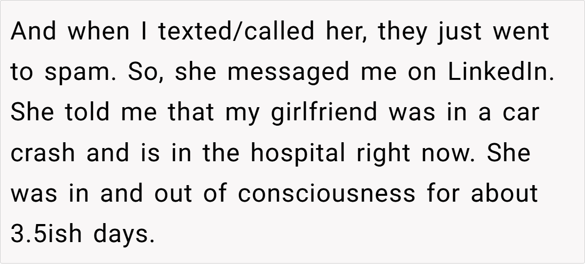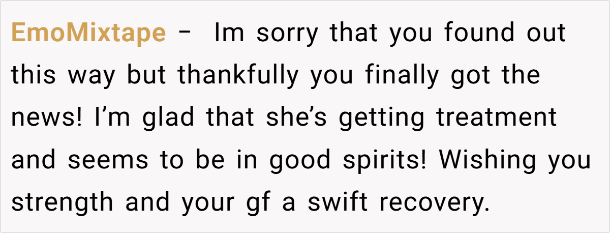 Others commend him for taking prompt action by checking in with the hospital and planning to visit, while some offer advice on managing the emotional fallout of such traumatic news. Overall, the consensus is that while his shock is understandable, prioritizing both his girlfriend’s recovery and his own emotional well-being is key during this challenging time.