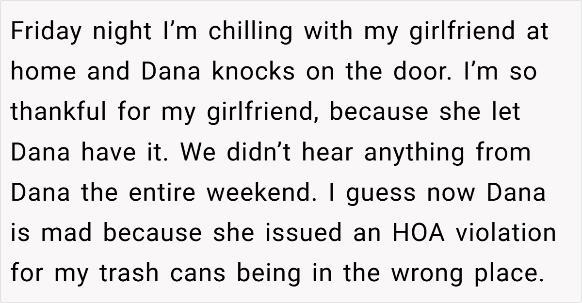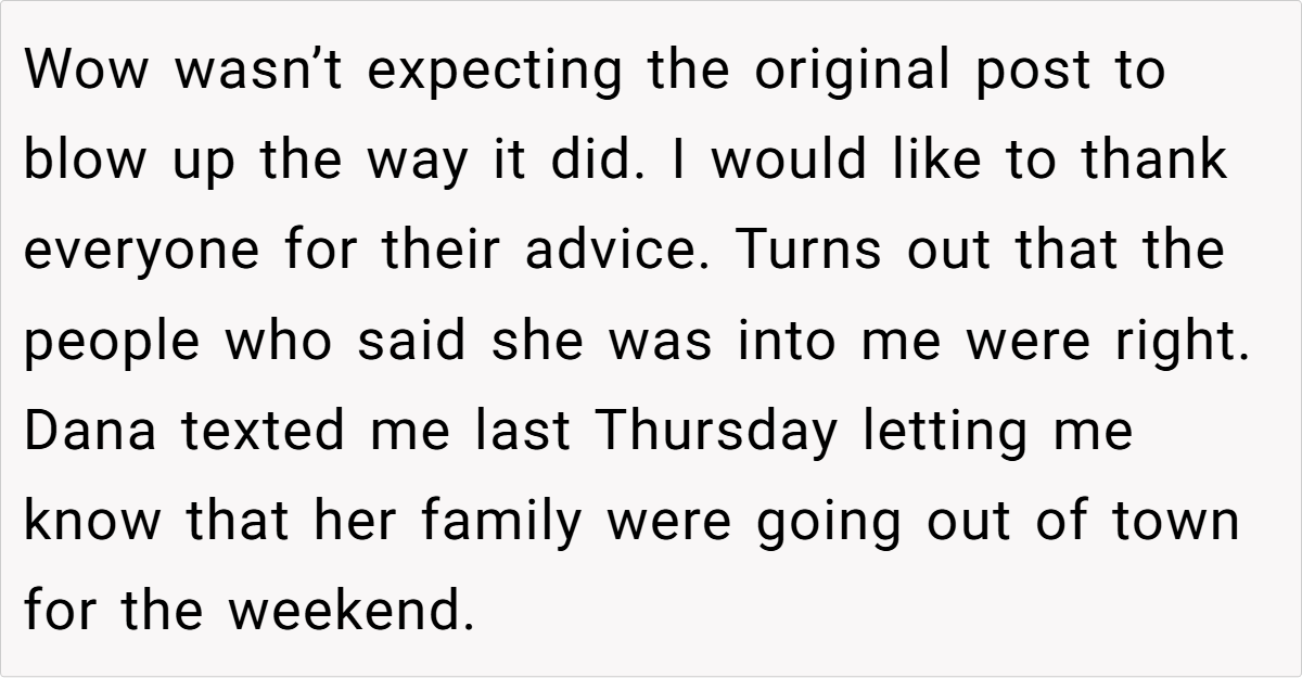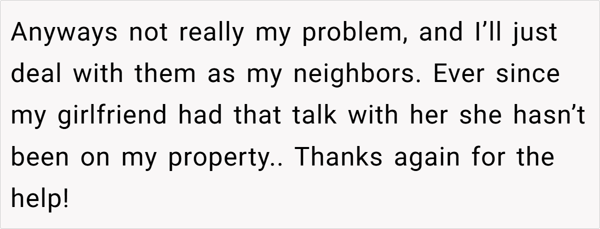 This update highlights how a seemingly simple case of uninvited neighborly attention can escalate into a broader issue involving property disputes and personal boundaries. The poster’s experience—from the unexpected text invitation to the intervention by his girlfriend