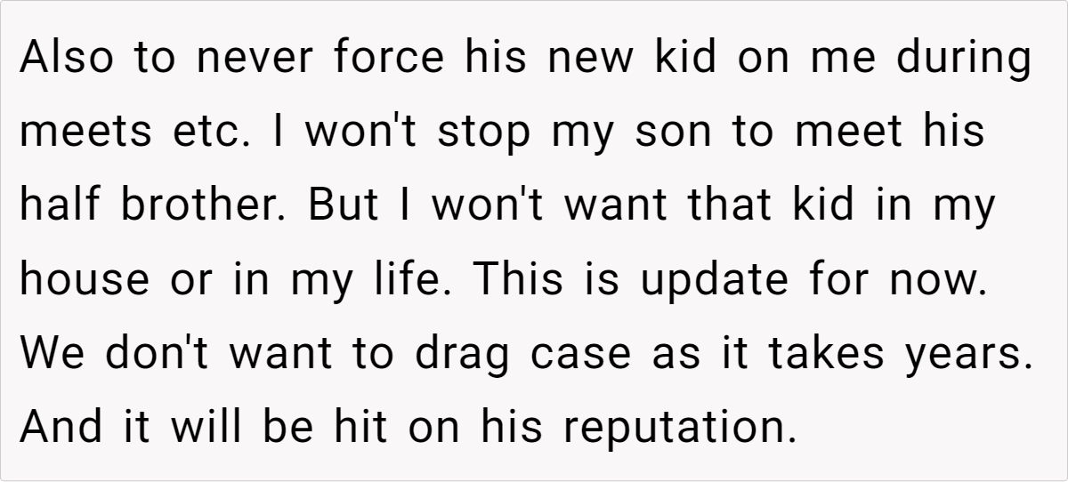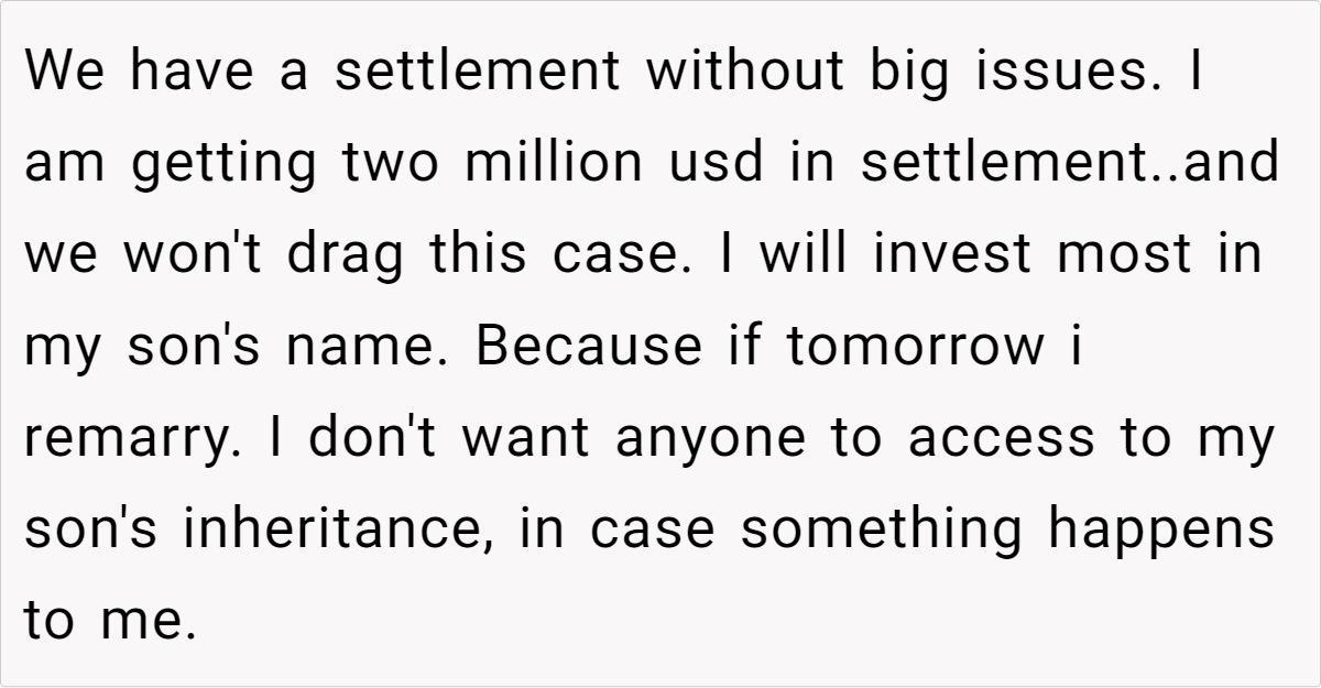 In the aftermath of a painful divorce and betrayal, this update stands as a testament to taking control of one’s future. By securing a robust settlement and setting unwavering boundaries, the poster is charting a course for stability—for both herself and her son. The decisions she makes now may not resolve every emotional scar, but they do establish a firm foundation for a healthier future.