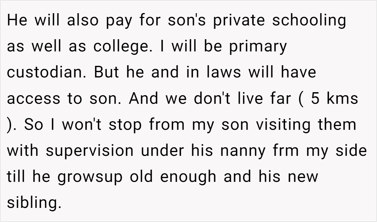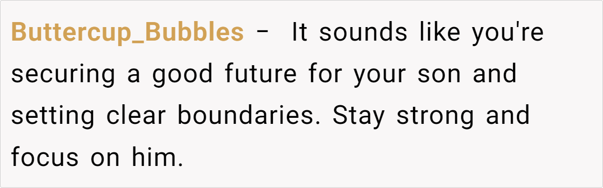 In this case, OP’s decision to prioritize her son’s financial security and emotional well-being is commendable. By securing a significant financial settlement and ensuring her son’s access to quality education, she’s demonstrating her commitment to his future. Dr. Ahrons notes that “Providing children with a sense of stability and security during times of transition is crucial for their emotional development and overall well-being.”