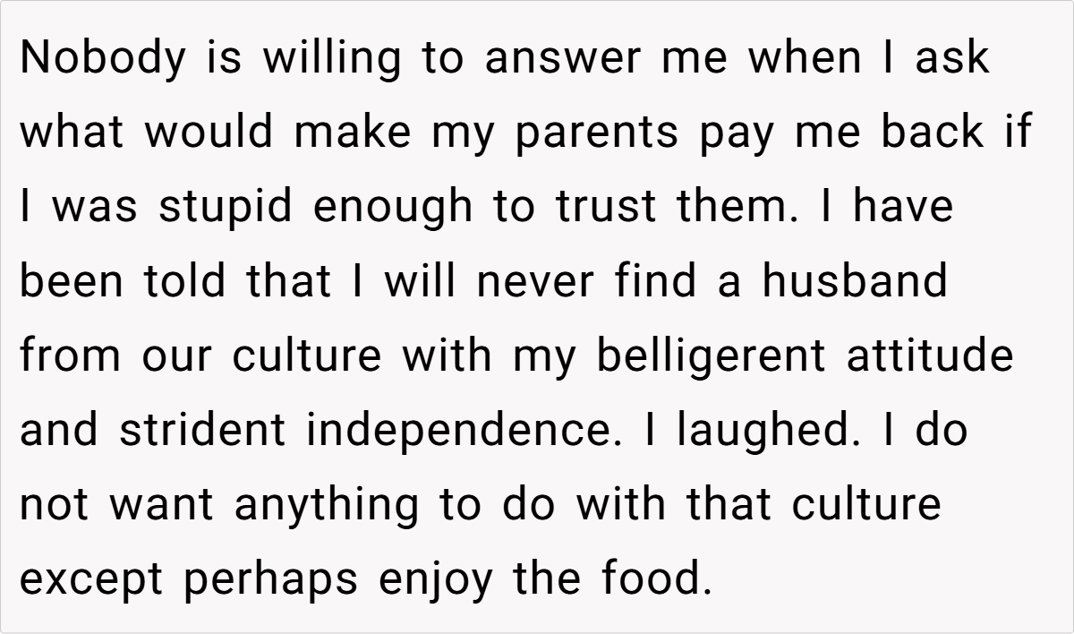 This story is a powerful reminder that sometimes we must sever ties with the past to move toward a future where we can thrive on our own terms. The Redditor’s courage to stand up for their financial and personal autonomy is an inspiring example of how independence can be the key to finding happiness, even if it means letting go of long-held familial and cultural bonds. Do you think the Redditor made the right decision, or is there more to be learned from the complexities of family ties and cultural expectations? Share your thoughts below.
