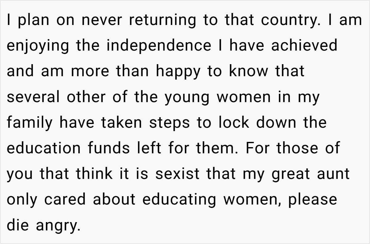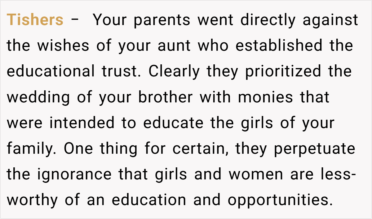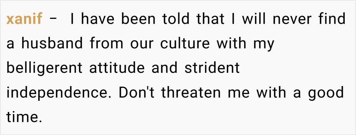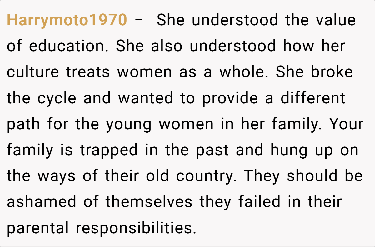 The Reddit community was full of support for the Redditor’s actions, recognizing the courage it took to stand up for themselves despite cultural backlash. Many praised the Redditor for asserting their independence and for rejecting the traditional gender roles and expectations tied to their cultural background. Users were particularly vocal about how the Redditor’s great aunt was a positive force in this situation, providing a legacy of education for the women in the family.