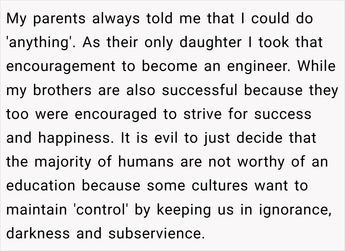 Others emphasized the significance of pursuing education and self-empowerment over family pressures, with many sharing similar stories of overcoming restrictive cultural expectations. For some, the Redditor’s story became a symbol of breaking free from cycles of oppression and carving out a path of personal success.